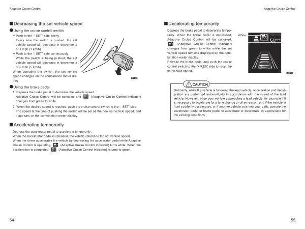 1 . Depress the brake pedal to decrease the vehicle speed . Adaptive Cruise Control will be canceled and ( Adaptive Cruise Control indicator ) changes from green to white .