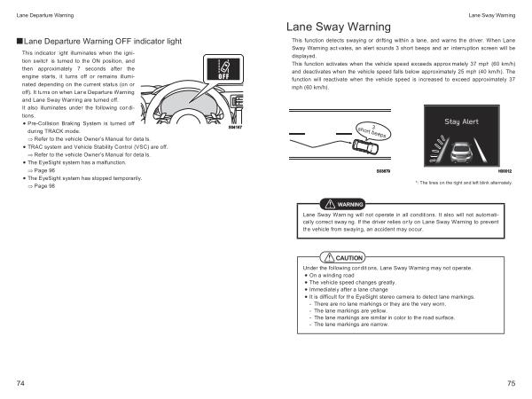 This indicator light illuminates when the ignition switch is turned to the ON position , and then approximately 7 seconds after the engine starts , it turns off or remains illuminated depending on the current status ( on or off ). It turns on when Lane Departure Warning and Lane Sway Warning are turned off . It also illuminates under the following conditions .