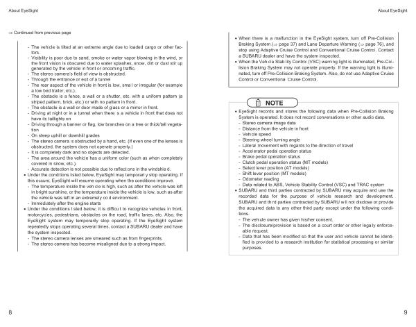 • EyeSight records and stores the following data when Pre-Collision Braking System is operated . It does not record conversations or other audio data . - Stereo camera image data - Distance from the vehicle in front - Vehicle speed - Steering wheel turning angle - Lateral movement with regards to the direction of travel - Accelerator pedal operation status - Brake pedal operation status - Clutch pedal operation status ( MT models ) - Select lever position ( AT models ) - Shift lever position ( MT models ) - Odometer reading - Data related to ABS , Vehicle Stability Control ( VSC ) and TRAC system