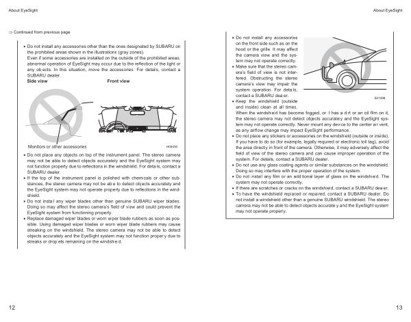 • Do not place any stickers or accessories on the windshield ( outside or inside ). If you have to do so ( for example , legally required or electronic toll tag ), avoid the area directly in front of the camera . Otherwise , it may adversely affect the field of view of the stereo camera and can cause improper operation of the system . For details , contact a SUBARU dealer .