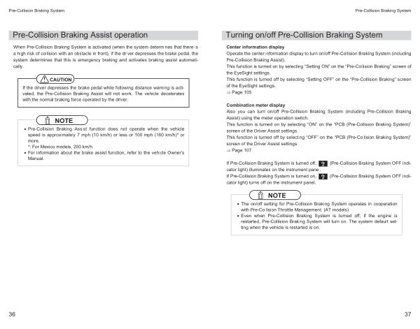 Center information display Operate the center information display to turn on / off Pre-Collision Braking System ( including Pre-Collision Braking Assist ). This function is turned on by selecting “ Setting ON ” on the “ Pre-Collision Braking ” screen of the EyeSight settings . This function is turned off by selecting “ Setting OFF ” on the “ Pre-Collision Braking ” screen of the EyeSight settings .
