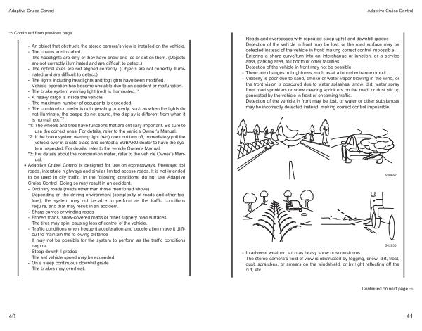 - An object that obstructs the stereo camera ’ s view is installed on the vehicle . - Tire chains are installed . - The headlights are dirty or they have snow and ice or dirt on them . ( Objects are not correctly illuminated and are difficult to detect .) - The optical axes are not aligned correctly . ( Objects are not correctly illuminated and are difficult to detect .) - The lights including headlights and fog lights have been modified . - Vehicle operation has become unstable due to an accident or malfunction . - The brake system warning light ( red ) is illuminated . * 2 - A heavy cargo is inside the vehicle . - The maximum number of occupants is exceeded . - The combination meter is not operating properly ; such as when the lights do not illuminate , the beeps do not sound , the display is different from when it is normal , etc . * 3