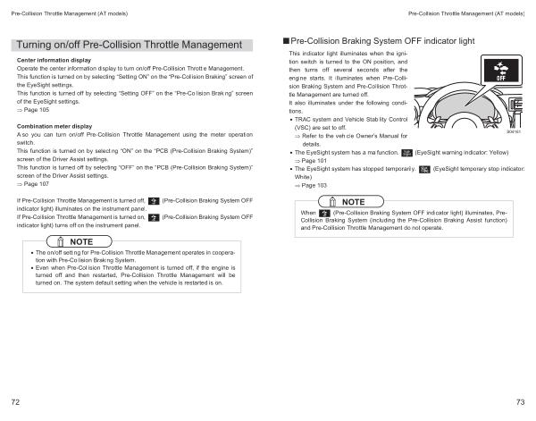 Center information display Operate the center information display to turn on / off Pre-Collision Throttle Management . This function is turned on by selecting “ Setting ON ” on the “ Pre-Collision Braking ” screen of the EyeSight settings . This function is turned off by selecting “ Setting OFF ” on the “ Pre-Collision Braking ” screen of the EyeSight settings .