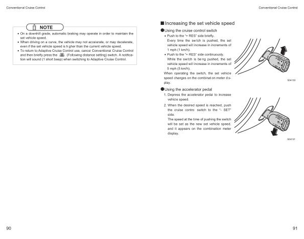 • Push to the “+ RES ” side briefly . Every time the switch is pushed , the set vehicle speed will increase in increments of 1 mph ( 1 km / h ).