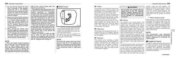 WARNING Do not drive the vehicle with the select lever in the “ N ” ( neutral ) position . Engine braking has no effect in this condition and the risk of an accident is consequently increased . This position is for normal driving . The transmission shifts automatically into a suitable gear according to the vehicle speed and the acceleration you require . Also , while driving up and down a hill , the transmission assists and controls the driving performance and engine braking while corresponding to the road grade .