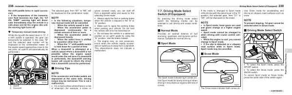 � In the following situations , temporary manual mode will be cancelled . - When the vehicle speed is low - When the accelerator pedal is depressed continuously for a certain amount of time or more - When the accelerator pedal is depressed heavily - When the select lever is shifted to a position other than “ D ” - When the “+” shift paddle switch is held down for a period of time