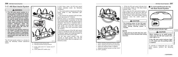 When using the Hill start assist system , a braking effect may be felt even after the brake pedal has been released . However , for MT models , this braking effect should disappear once the clutch pedal is released . CAUTION The braking power of the Hill start assist system may not be sufficient when strong braking power is needed .