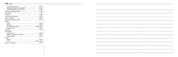 Index SRS airbag system .......................................................... P135 Steering Responsive Headlight ....................................... P150 Vehicle Stability Control ( VSC )........................................ P142 Warning message display .................................................... P158 Warranties ................................................................................ P2 Washing ............................................................................... P328 Waxing and polishing ........................................................... P329 Wear indicators .................................................................... P359 Welcome lighting function .................................................... P174 Wheel Alloy ................................................................................. P362 Balance ............................................................................ P359 Nut tightening torque ............................................ P299 , P381 Replacement ................................................................... P361 Windows ............................................................................... P116 Windshield Washer fluid ..................................................................... P362 Wiper and washer switches ............................................. P181 Wiper blades .................................................................... P364