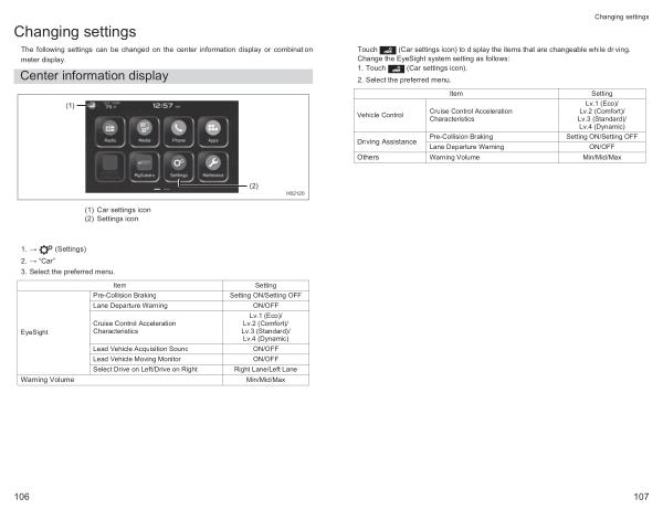 Touch ( Car settings icon ) to display the items that are changeable while driving . Change the EyeSight system setting as follows : 1 . Touch ( Car settings icon ).