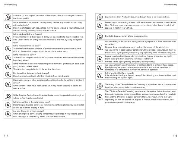 Are you driving in the rain with poorly performing wipers or is there a smear on the windshield ? Replace the wipers with new ones , or clean the smear off the windshield . Are you driving in poor weather conditions with heavy rain , snow , fog , or dust ? In these cases , EyeSight may temporarily stop operating while visibility is very poor . Is your vehicle subject to sunlight from the front ( sunset or sunrise , etc .) or to bright headlights from oncoming vehicles at nighttime ? In these cases , EyeSight may temporarily stop operating .
