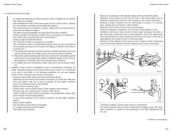 - Entering a sharp curve / turn into an interchange or junction , or a service area , parking area , toll booth or other facilities Detection of the vehicle in front may not be possible . - There are changes in brightness , such as at a tunnel entrance or exit . - Visibility is poor due to sand , smoke or water vapor blowing in the wind , or the front vision is obscured due to water splashes , snow , dirt , water spray from road sprinklers or snow clearing sprinklers on the road , or dust stir up generated by the vehicle in front or oncoming traffic . Detection of the vehicle in front may be lost , or water or other substances may be incorrectly detected instead , making correct control impossible .