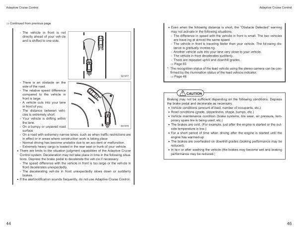 • Even when the following distance is short , the “ Obstacle Detected ” warning may not activate in the following situations . - The difference in speed with the vehicle in front is small . The two vehicles are traveling at almost the same speed . - The vehicle in front is traveling faster than your vehicle . The following distance is gradually increasing . - Another vehicle cuts into your lane very close to your vehicle . - The vehicle in front decelerates suddenly . - There are repeated uphill and downhill grades .