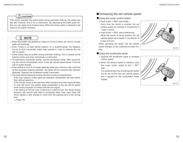 • Push to the “+ RES ” side briefly . Every time the switch is pushed , the set vehicle speed will increase in increments of 1 mph ( 1 km / h ).
