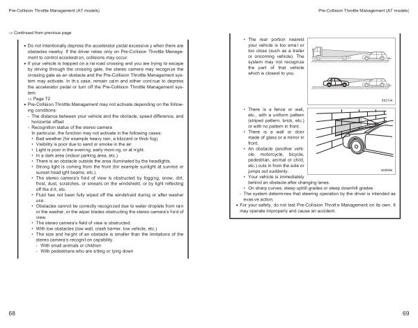 • If your vehicle is trapped on a railroad crossing and you are trying to escape by driving through the crossing gate , the stereo camera may recognize the crossing gate as an obstacle and the Pre-Collision Throttle Management system may activate . In this case , remain calm and either continue to depress the accelerator pedal or turn off the Pre-Collision Throttle Management system .