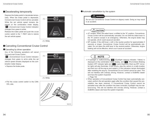 • When operation of Conventional Cruise Control has been automatically canceled , perform the set operation again after the condition that caused the cancellation has been resolved . If Conventional Cruise Control cannot be activated even after the condition has been corrected , EyeSight may be malfunctioning . This will not interfere with ordinary driving . However , contact a SUBARU dealer and have the system inspected .