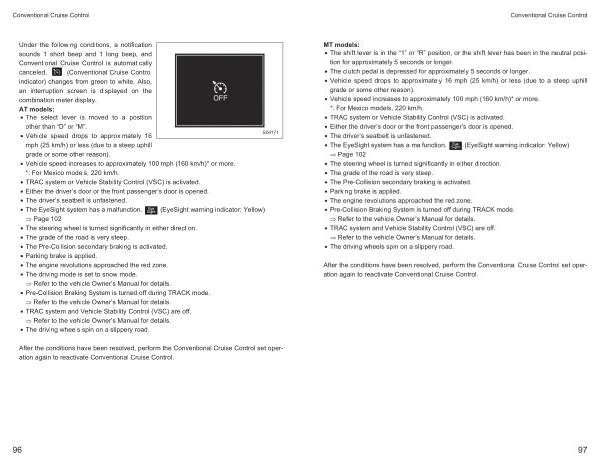 Under the following conditions , a notification sounds 1 short beep and 1 long beep , and Conventional Cruise Control is automatically canceled . ( Conventional Cruise Control indicator ) changes from green to white . Also , an interruption screen is displayed on the combination meter display . AT models :