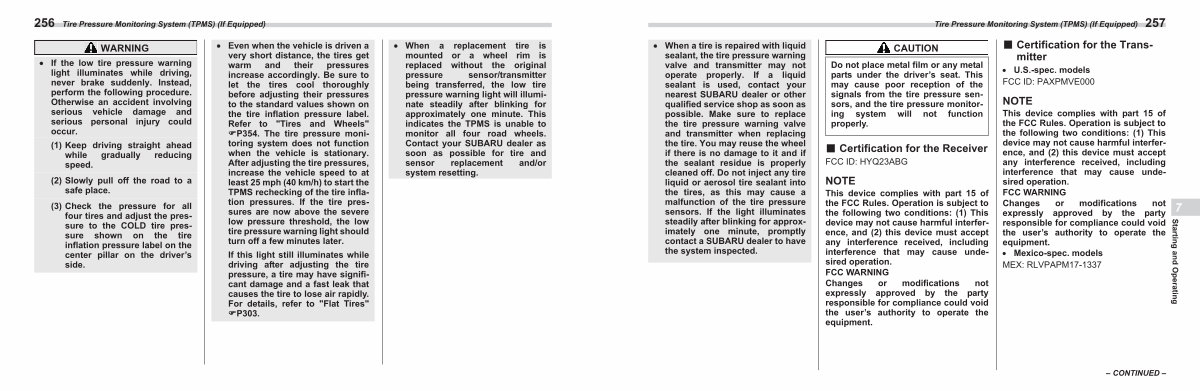When a tire is repaired with liquid sealant, the tire pressure warning valve and transmitter may not operate properly. If a liquid sealant is used, contact your nearest SUBARU dealer or other qualified service shop as soon as possible. Make sure to replace the tire pressure warning valve and transmitter when replacing the tire. You may reuse the wheel if there is no damage to it and if the sealant residue is properly cleaned off. Do not inject any tire liquid or aerosol tire sealant into the tires, as this may cause a malfunction of the tire pressure sensors. If the light illuminates steadily after blinking for approximately one minute, promptly contact a SUBARU dealer to have the system inspected.