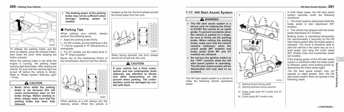 � The Hill start assist system is a device only for helping the driver to START the vehicle on an uphill grade. To prevent accidents when the vehicle is parked on a slope, be sure to firmly set the parking brake. When setting the parking brake, make sure that the vehicle remains stationary when the clutch pedal( MT models) and brake pedal( both MT and AT models) are released.