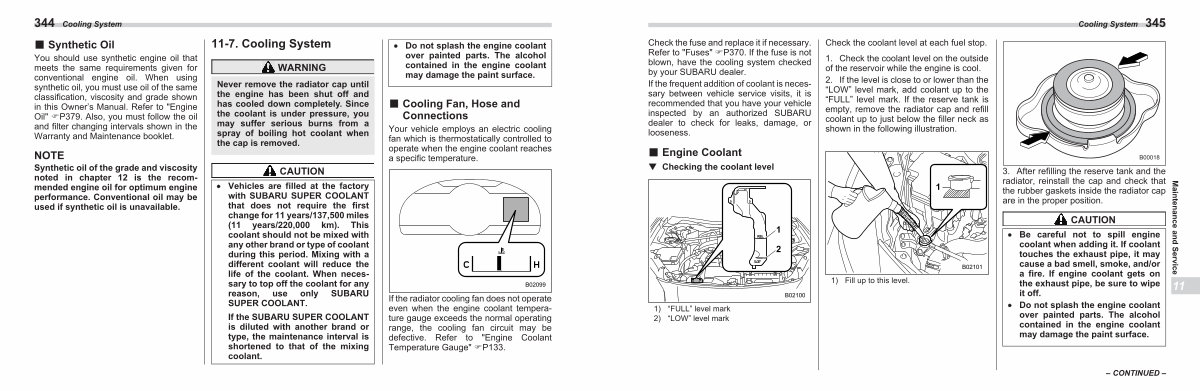 Check the fuse and replace it if necessary. Refer to " Fuses " �P370. If the fuse is not blown, have the cooling system checked by your SUBARU dealer. If the frequent addition of coolant is necessary between vehicle service visits, it is recommended that you have your vehicle inspected by an authorized SUBARU dealer to check for leaks, damage, or looseness. ■ Engine Coolant