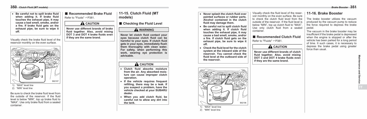 Clutch Fluid( MT models) Be careful not to spill brake fluid when adding it. If brake fluid touches the exhaust pipe, it may cause a bad smell, smoke, and / or a fire. If brake fluid gets on the exhaust pipe, be sure to wipe it off.