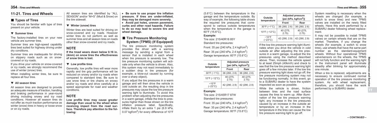 Adjusted pressure [ psi( kPa, kgf / cm 2)] Front Rear 30 ° F( −1 ° C) 38( 260, 2.6) 38( 260, 2.6)