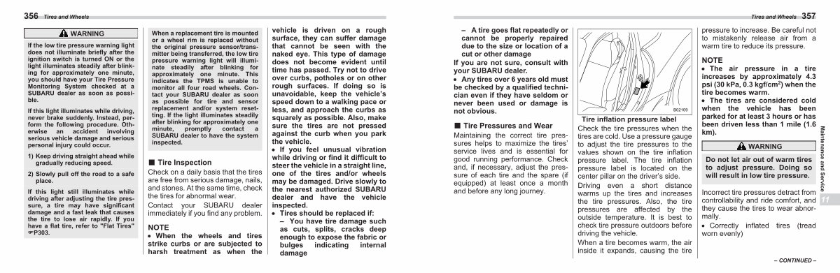 – A tire goes flat repeatedly or cannot be properly repaired due to the size or location of a cut or other damage If you are not sure, consult with your SUBARU dealer. � Any tires over 6 years old must be checked by a qualified technician even if they have seldom or never been used or damage is not obvious. ■ Tire Pressures and Wear