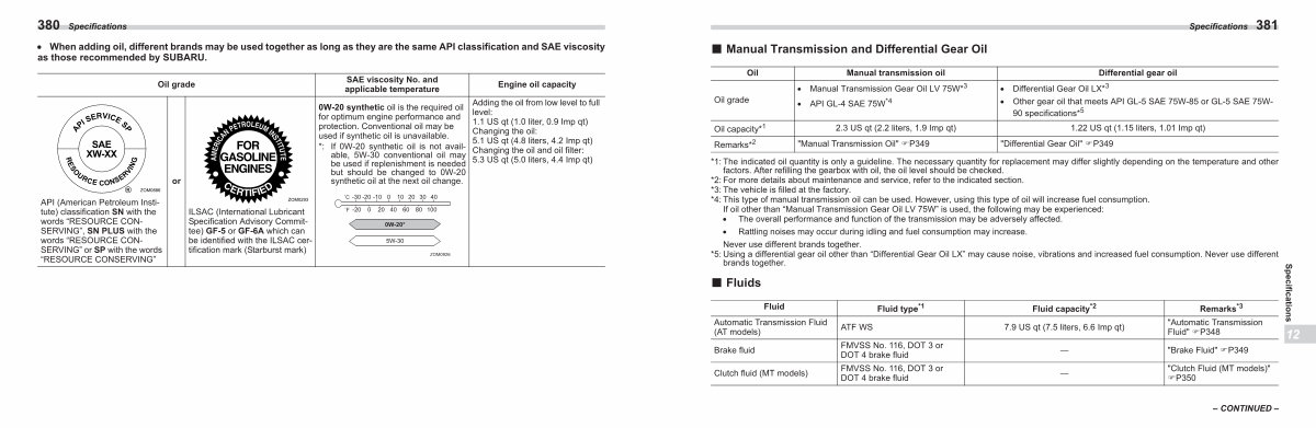 Specifications � When adding oil, different brands may be used together as long as they are the sam as those recommended by SUBARU. Oil grade
