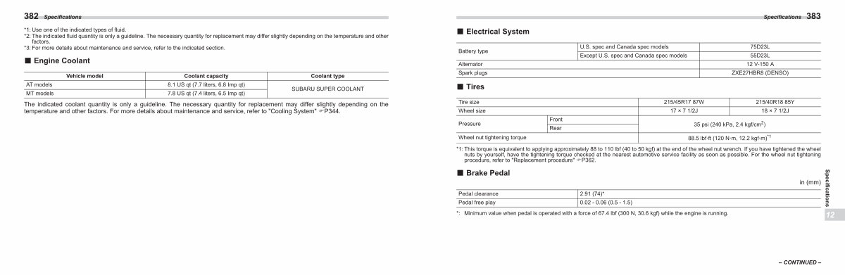 U. S. spec and Canada spec models Except U. S. spec and Canada spec models ■ Tires Tire size 215 / 45R17 87 Wheel size