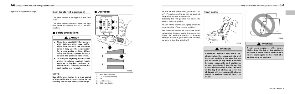 Seat, seatbelt and SRS airbags/Rear seats To turn on the seat heater, push the “LO” or “HI” position on the switch, as desired, depending on the temperature. Selecting the “HI” position will cause the seat to heat up quicker. 1-7 Rear seats To turn off the seat heater, lightly press the opposite side of the current position. The indicator located on the switch illuminates when the seat heater is in operation. When the vehicle’s interior is warmed enough or before you leave the vehicle, be sure to turn the switch off. WARNING WARNING Seatbelts provide maximum restraint when the occupant sits well back and upright in the seat. Do not put cushions or any other materials between occupants and seatbacks or seat cushions. If you do so, the risk of sliding under the lap belt and of the lap belt sliding up over the abdomen will increase, and both can result in serious internal injury or death. Never stack luggage or other cargo higher than the top of the seatback because it could tumble forward and injure passengers in the event of a sudden stop or accident. – CONTINUED –