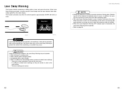 Lane Sway Warning will not operate in all conditions. It also will not automatically correct wandering. If the driver relies only on the Lane Sway Warning to