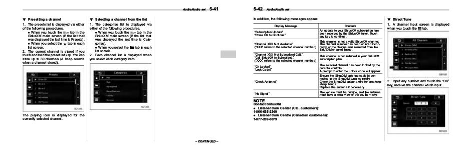 5-42 Audio/Audio set ! Direct Tune In addition, the following messages appear. Display Message Contents “Subscription Update” “Press OK to Continue” An update to your SiriusXM subscription has been received by the SiriusXM tuner. Touch any key to continue. “Channel XXX Not Available” (“XXX” refers to the selected channel number.) This channel is not a valid SiriusXM channel. The channel number has been entered incorrectly, or the channel was removed from the SiriusXM channel lineup. “Channel XXX Not Subscribed Call.” “Call SiriusXM to Subscribed.” (“XXX” refers to the selected channel number.) This channel is not included in your SiriusXM subscription plan. “Ch Locked” “Lock Code?” The selected channel has been locked by the parental controls. A prompt to enter the unlock code will appear. “Check Antenna” Ensure the SiriusXM antenna cable is connected to the SiriusXM tuner correctly. Check the SiriusXM antenna wire for breaks or sharp bends. Replace the antenna if necessary. “No Signal” The vehicle must be outside, and the antenna must have a clear view of the southern sky. NOTE Contact SiriusXM . Listener Care Center (U.S. customers): 1-866-635-2349 . Listener Care Centre (Canadian customers): 1-877-209-0079 1. A channel input screen is displayed when you touch the tab. 2. Input any number and touch the “OK” key, receive the channel which input.