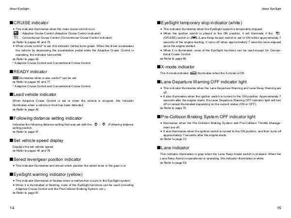 x This indicator illuminates or flashes when a malfunction occurs in the EyeSight system.