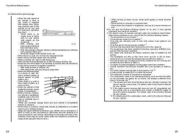 � The system may not operate correctly under the conditions listed below. When these conditions occur, turn off the Pre-Collision Braking System.- The tire pressure is not correct. * 1- The temporary spare tire is installed. * 1- Tires that are unevenly worn or tires with uneven wear patterns are installed. * 1- Tires that are the wrong size are installed. * 1- Flat tires that have been fixed temporarily with a tire repair kit.- The suspension has been modified( including a genuine SUBARU suspension that has been modified).- Any object that obstructs the stereo camera’ s view is installed on the vehicle.- The headlights are dirty or they have snow and ice or dirt on them.