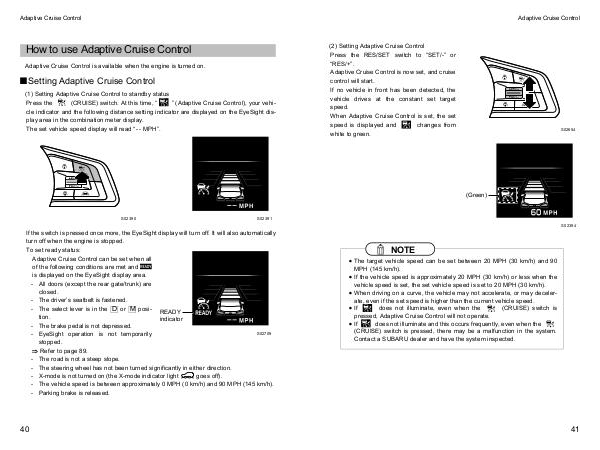 If the switch is pressed once more, the EyeSight display will turn off. It will also automatically turn off when the engine is stopped. To set ready status: Adaptive Cruise Control can be set when all of the following conditions are met and is displayed on the EyeSight display area.- All doors( except the rear gate / trunk) are closed.- The driver’ s seatbelt is fastened.- The select lever is in the D or M position.- The brake pedal is not depressed.- EyeSight operation is not temporarily stopped.