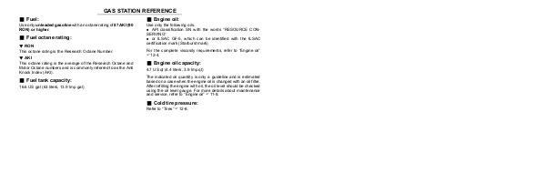 The indicated oil quantity is only a guideline and is estimated based on a case when the engine oil is changed with an oil filter. After refilling the engine with oil, the oil level should be checked using the oil level gauge. For more details about maintenance and service, refer to“ Engine oil” ☞11-8.