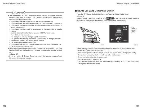 • The performance of Lane Centering Function may not be optimal under the following conditions . In addition , Lane Centering Function may not operate or the operation may be canceled . - Immediately after the weight of your vehicle changes radically - Immediately after the replacement of a tire or the adjustment of tire pressure - Immediately after the adjustment , repair or replacement of the camera or related components - Immediately after the repair or replacement of the suspension or steering system - A winter tire or a tire other than a genuine SUBARU tire is used . - The vehicle is in a crosswind . - The road grade abruptly changes ( uphill or downhill ). - The grade of the crossing direction in a road is large or changes abruptly . - Unevenness , winding and joint of a road surface - The acceleration / deceleration is high . - Immediately after starting the engine when the outside temperature is low . - The outside temperature is high .
