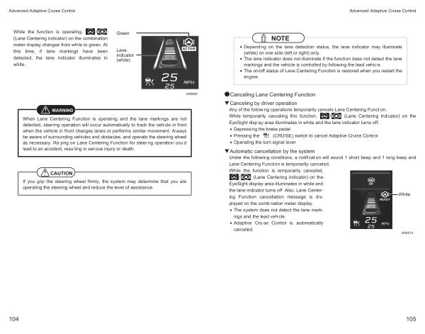 �Canceling by driver operation Any of the following operations temporarily cancels Lane Centering Function . While temporarily canceling this function , / ( Lane Centering indicator ) on the EyeSight display area illuminates in white and the lane indicator turns off .