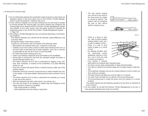 • If your vehicle is trapped on a railroad crossing and you are trying to escape by driving through the crossing gate , the stereo camera may recognize the crossing gate as an obstacle and Pre-Collision Throttle Management system may activate . In this case , remain calm and either continue to depress the accelerator pedal or turn off the Pre-Collision Throttle Management system .