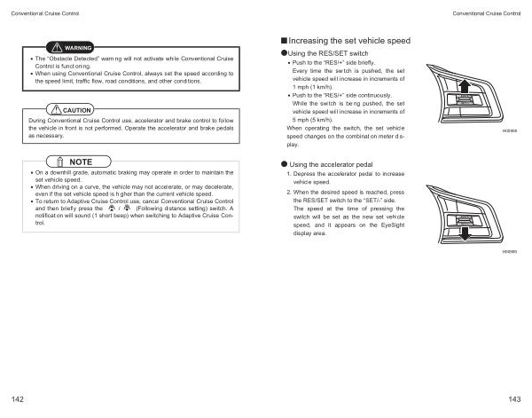 2 . When the desired speed is reached , press the RES / SET switch to the “ SET / -” side . The speed at the time of pressing the switch will be set as the new set vehicle speed , and it appears on the EyeSight display area .
