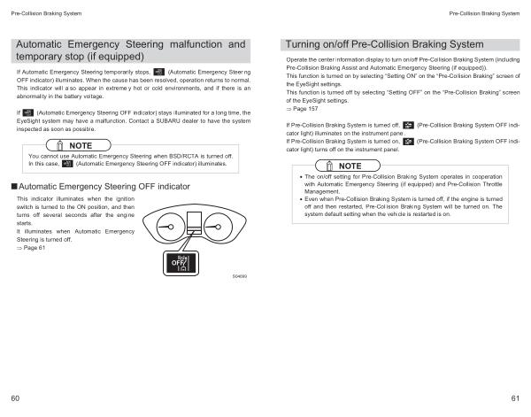 If ( Automatic Emergency Steering OFF indicator ) stays illuminated for a long time , the EyeSight system may have a malfunction . Contact a SUBARU dealer to have the system inspected as soon as possible .
