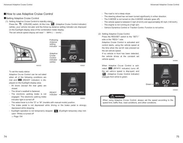 - The road is not a steep slope . - The steering wheel has not been turned significantly in either direction . - The X-MODE is not turned on ( the X-MODE indicator goes off ). - The vehicle speed is between 0 mph ( 0 km / h ) and approximately 90 mph ( 145 km / h ). - The engine is not running at a high rpm . - Vehicle Dynamics Control or Traction Control Function is not active .