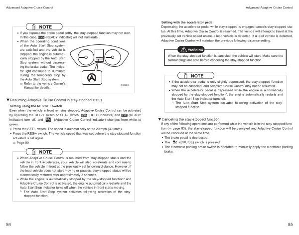 • Press the RES /+ switch . The vehicle speed that was set before the stay-stopped function activated is set again .