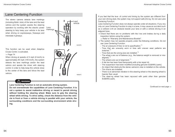 � Page 74 When driving at speeds of 0 mph ( 0 km / h ) to approximately 90 mph ( 145 km / h ), the system detects the lane markings and / or the lead vehicle and assists the driver with steering control in order to help keep the vehicle close to the center of the lane and follow the lead vehicle .