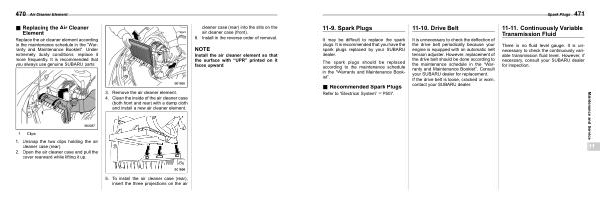 Replace the air cleaner element according to the maintenance schedule in the “ Warranty and Maintenance Booklet ”. Under extremely dusty conditions , replace it more frequently . It is recommended that you always use genuine SUBARU parts . cleaner case ( rear ) into the slits on the air cleaner case ( front ).