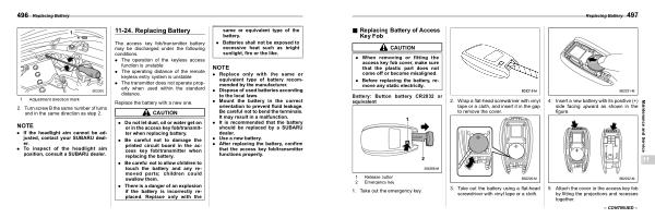 . It is recommended that the battery should be replaced by a SUBARU dealer . . Use a new battery . . After replacing the battery , confirm that the access key fob / transmitter functions properly .