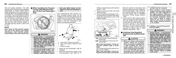 . NEVER INSTALL A REARWARD- FACING CHILD RESTRAINT SYS- TEM ON THE FRONT PASSEN- GER ’ S SEAT . DOING SO RISKS SERIOUS INJURY OR DEATH TO THE CHILD BY PLACING THE CHILD ’ S HEAD TOO CLOSE TO THE SRS AIRBAG .