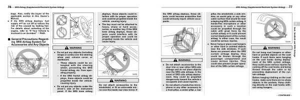 . Do not attach accessories to the door trim or near either SRS side airbags and do not place objects near the SRS side airbags . In the event of SRS side airbag deployment , they could be propelled dangerously toward the vehicle ’ s occupants and cause injuries .