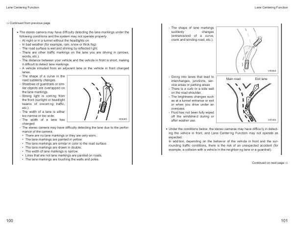 • Under the conditions below , the stereo cameras may have difficulty in detecting the vehicle in front , and Lane Centering Function may not operate as expected . In addition , depending on the behavior of the vehicle in front and the surrounding traffic conditions , there is the risk of an unexpected accident ( for example , a collision with a vehicle in the neighboring lane or a guardrail ).