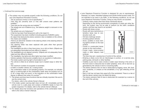 • The system may not operate properly under the following conditions . Do not use Lane Departure Prevention Function . - The air pressure of tires is not to specification . * 1 - Tires that are unevenly worn or tires with uneven wear patterns are installed . * 1 - Tires that are the wrong size are installed . * 1 - The wheels are out of balance ( e . g ., the balance weight is removed or misaligned ). * 1 - The wheels are out of alignment . * 1 - A flat tire has been fixed temporarily with a tire repair kit . - The suspension has been modified ( including genuine SUBARU parts ). - An object that obstructs the stereo camera ’ s view is installed on the vehicle . - Tire chains are installed . - There is an abnormal vibration in the steering wheel or the steering wheel is heavier than usual . - The steering wheel has been replaced with parts other than genuine