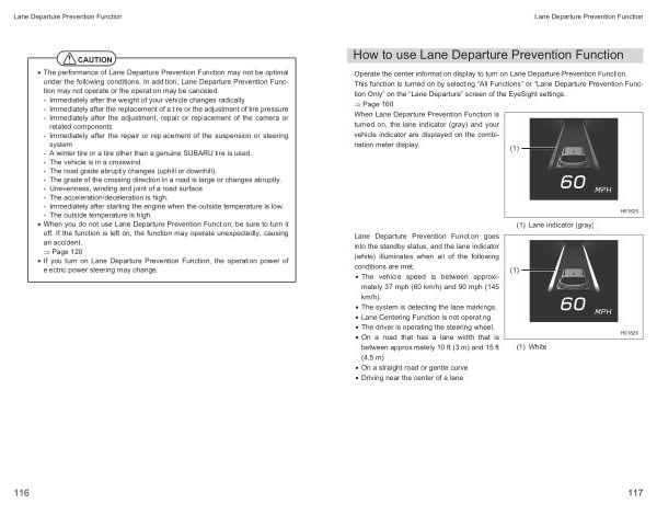 • The performance of Lane Departure Prevention Function may not be optimal under the following conditions . In addition , Lane Departure Prevention Function may not operate or the operation may be canceled . - Immediately after the weight of your vehicle changes radically - Immediately after the replacement of a tire or the adjustment of tire pressure - Immediately after the adjustment , repair or replacement of the camera or related components - Immediately after the repair or replacement of the suspension or steering system - A winter tire or a tire other than a genuine SUBARU tire is used . - The vehicle is in a crosswind . - The road grade abruptly changes ( uphill or downhill ). - The grade of the crossing direction in a road is large or changes abruptly . - Unevenness , winding and joint of a road surface - The acceleration / deceleration is high . - Immediately after starting the engine when the outside temperature is low . - The outside temperature is high .